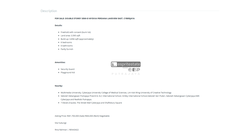 Menyenaraikan rumah di laman web hartanah terkenal atau platform popular dapat memastikan lebih ramai orang melihat rumah yang dijual. Semakin ramai orang melihat iklan tersebut, semakin tinggi peluang mendapat tawaran yang kompetitif. Ini juga memberi pemilik peluang menarik pembeli dari pelbagai latar belakang. Anda juga boleh menghubungi kami di ESP Putrajaya untuk menyenaraikan hartanah anda di website kami.